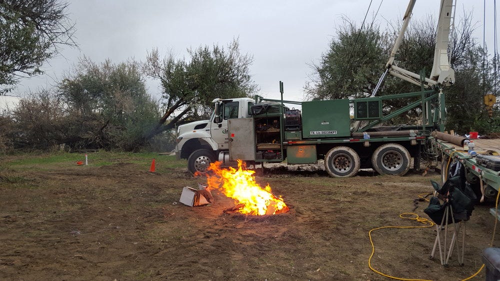 Now, when it’s -15F outside, the soybeans have frozen over and we’re conducting an all night pumping test...we build a bonfire to stay warm and I get to remind him “Don’t get burned.”